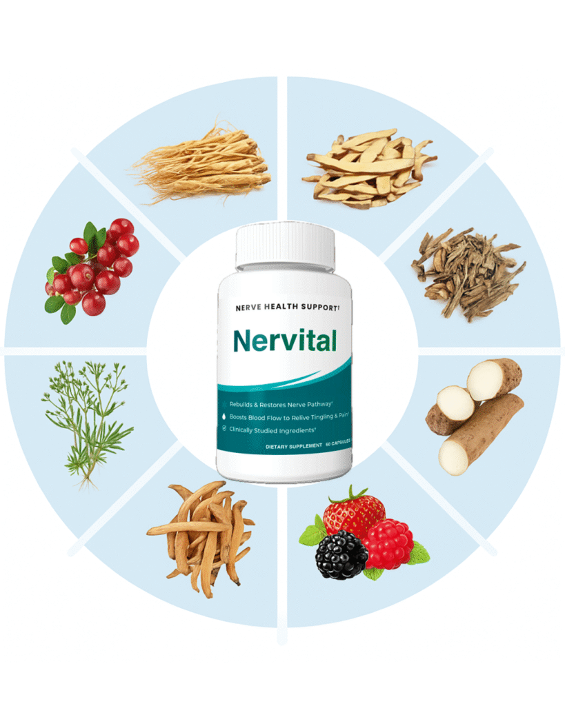 Nervital combines a unique blend of natural ingredients that work synergistically to restore nerve health, boost blood circulation, and relieve discomfort caused by tingling, numbness, and pain. The formula is specifically designed to address the root causes of nerve damage — inflammation, poor oxygen flow, and weakened neural communication.